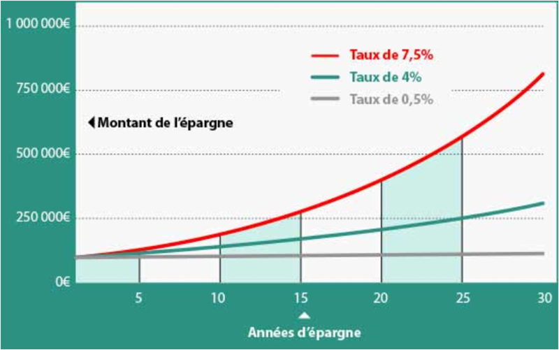 La même somme placée à 7,5% (soit un taux d’intérêt 15 fois supérieur) génère 775.000 euros de gains, soit 48 fois plus ! Même un différentiel de taux de rendement faible entre deux placements a un effet multiplicateur fort avec le temps.