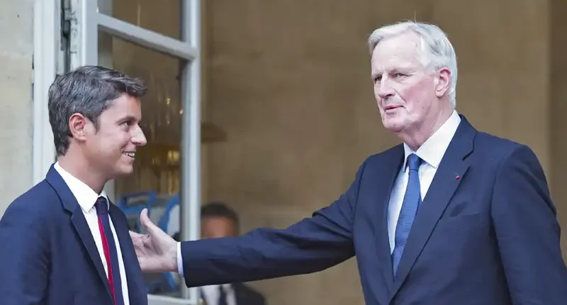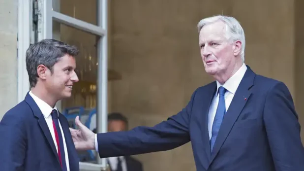 Gabriel Attal et Michel Barnier lors de la passation de pouvoir à Matignon, le 5 septembre. (Crédit : STEPHANE DE SAKUTIN / AFP)