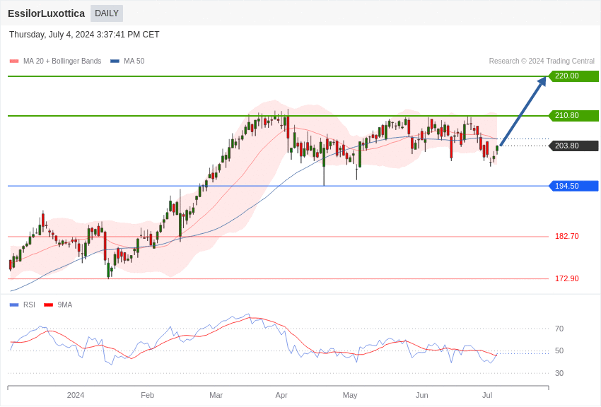 L'action du géant de l'optique est bien orientée au-dessus du support des 194,50 euros.
