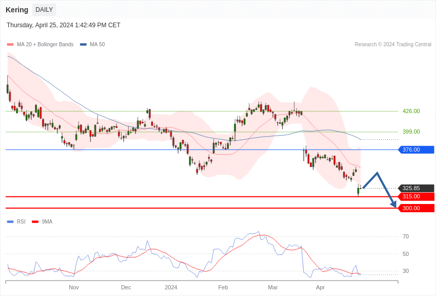 L’action Kering affiche une tendance graphique baissière sous le point pivot de 376 euros.
