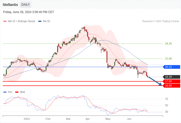 La tendance de l’action Stellantis est baissière, tant que le cours se maintient sous les 20,15 euros.