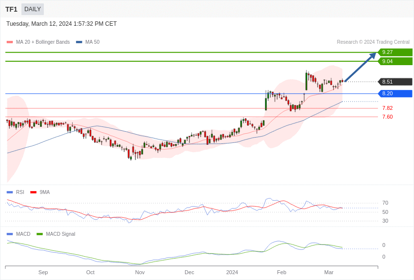 Tant que l’action TF1 évolue au-dessus du support de 8,20 euros elle affiche une configuration favorable et pourrait atteindre 9,04 euros.