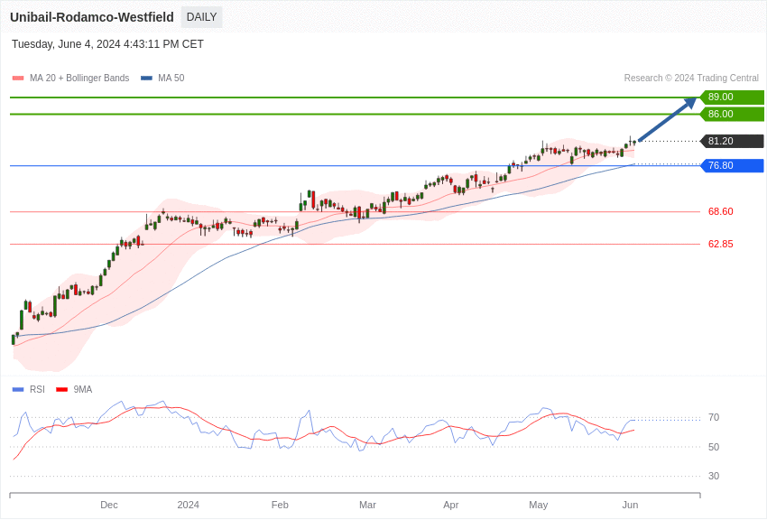 L’action Unibail-Rodamco-Westfield affiche une tendance positive, avec un support à 76,80 euros.