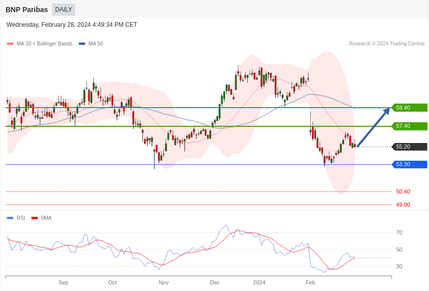 L’action BNP Paribas affiche une configuration haussière au-dessus de 53,30 euros.